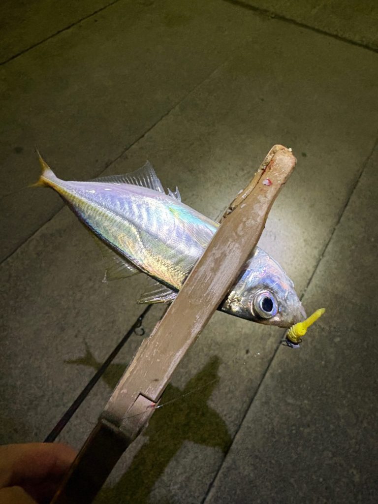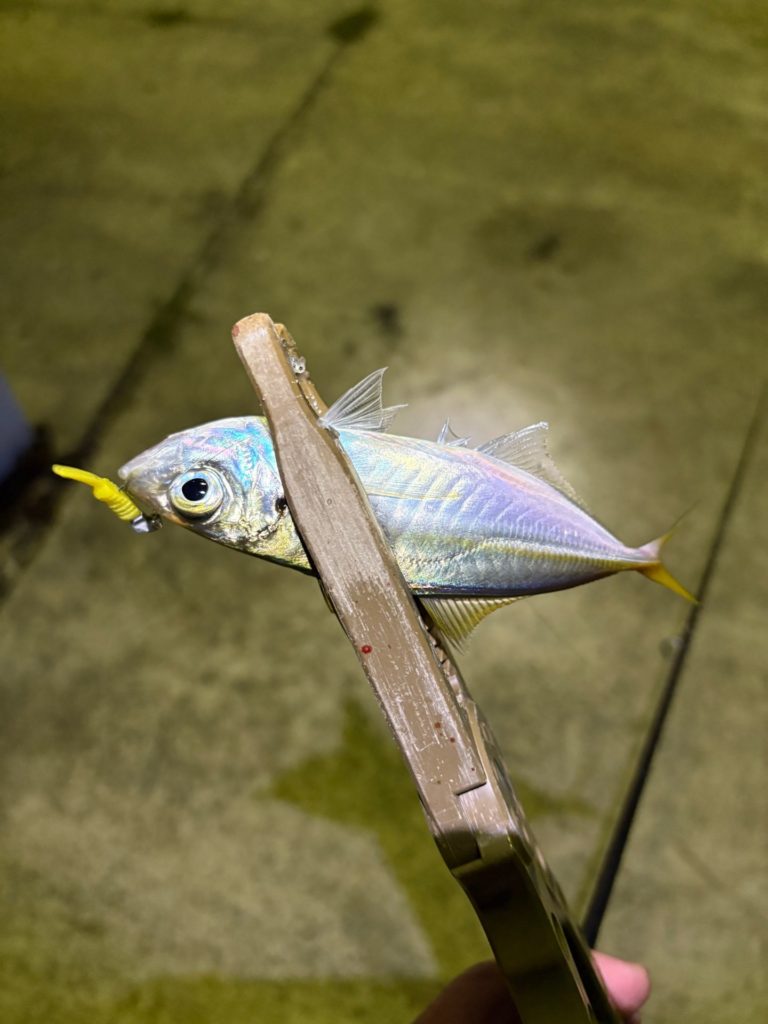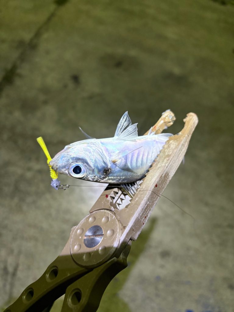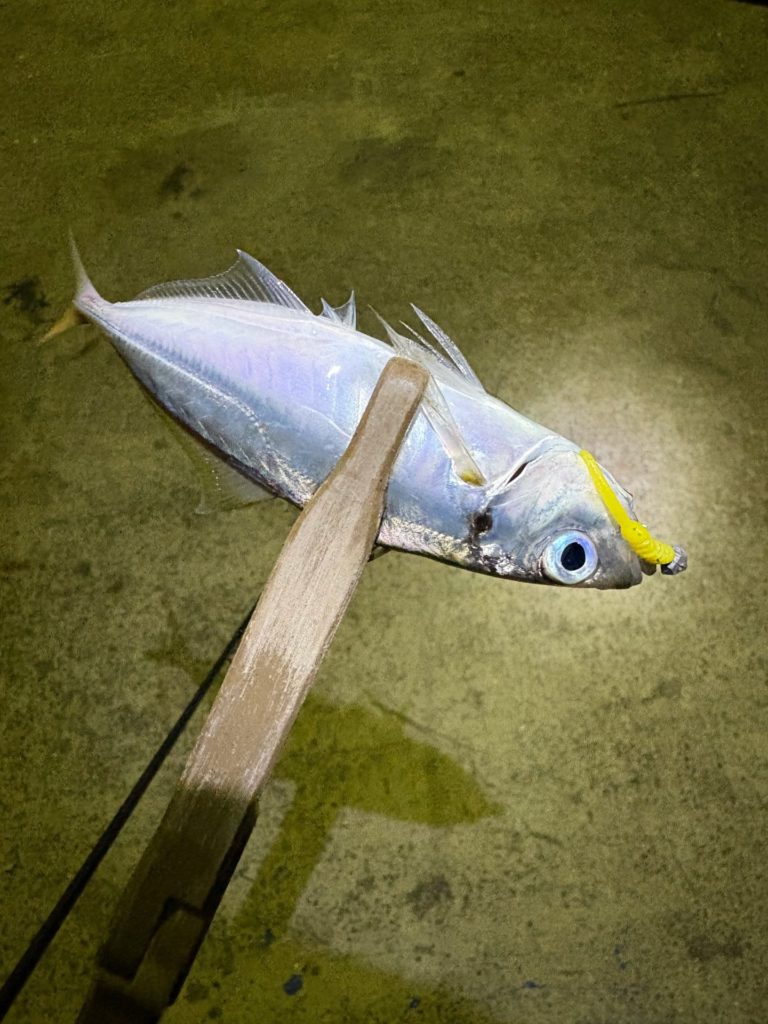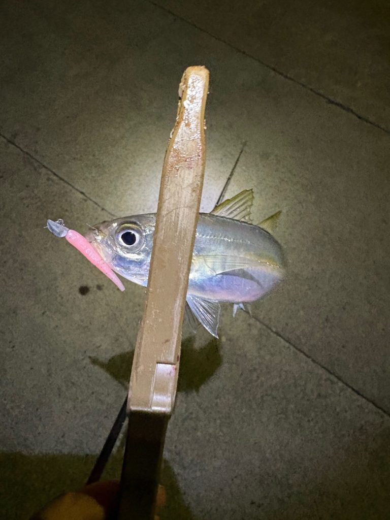 豆アジの時と違い、ワームは少し大きめだし、ジグヘッドも少し重めにしていますが、反応して釣れました。