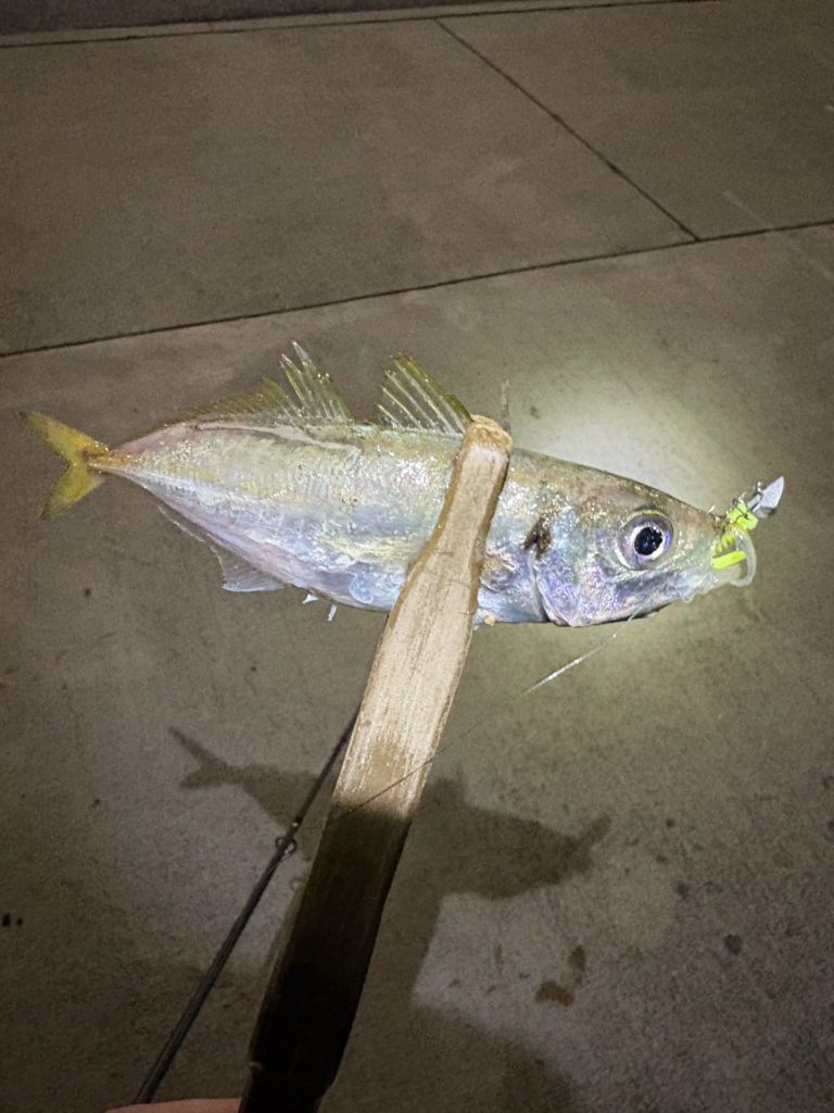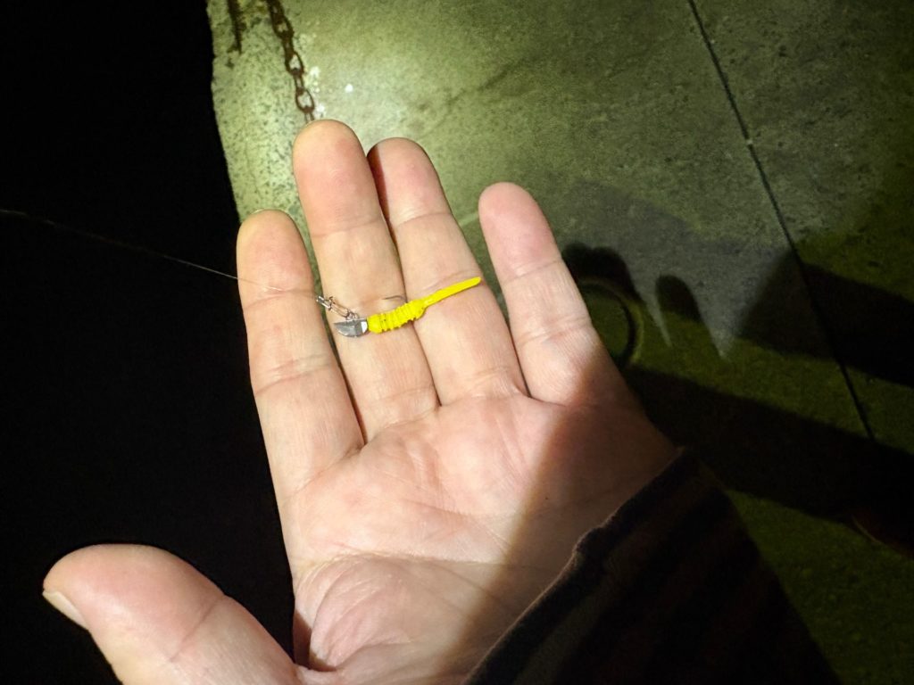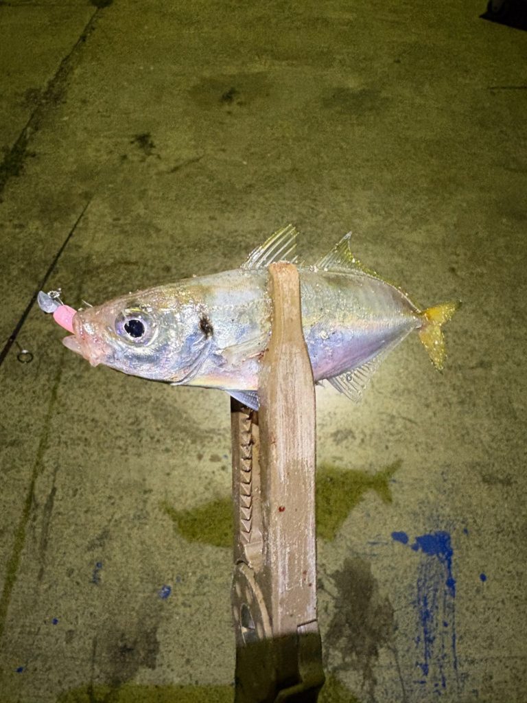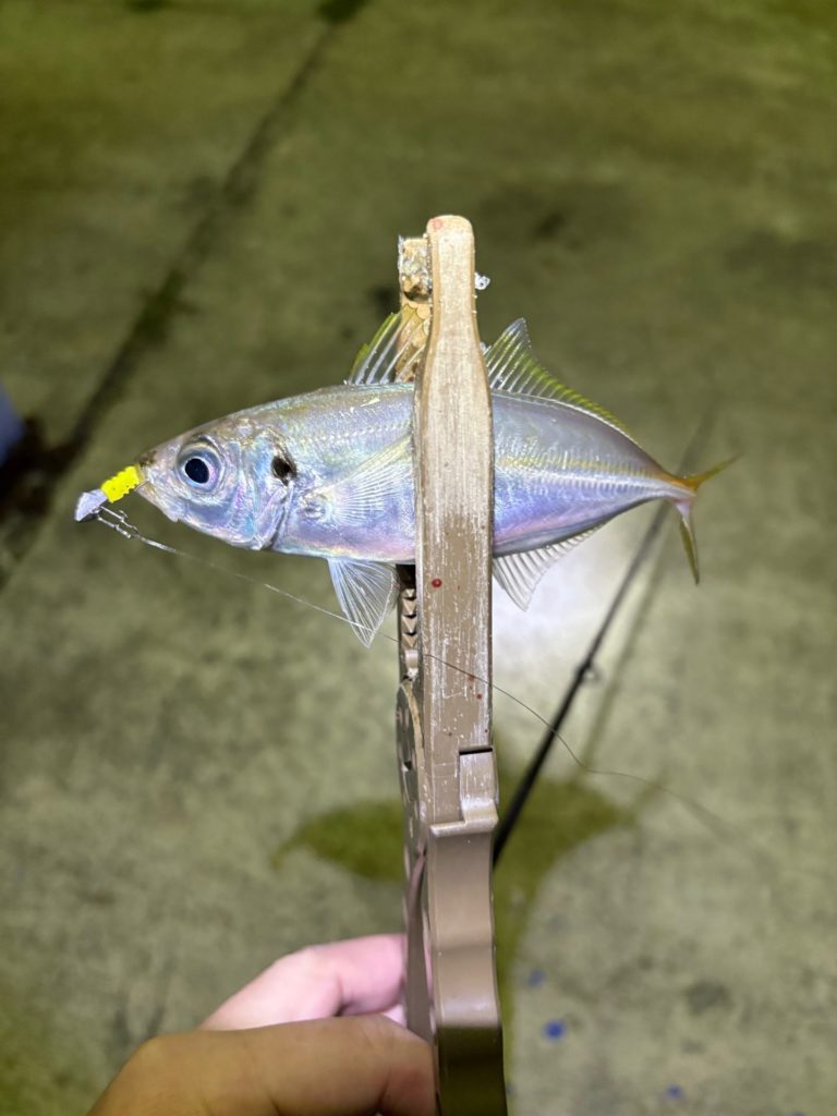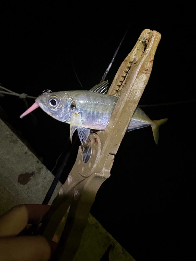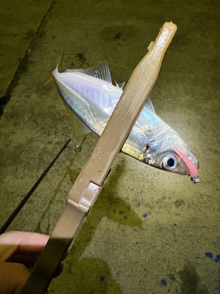 豆アジの時と違い、ワームは少し大きめだし、ジグヘッドも少し重めにしていますが、反応して釣れました。
