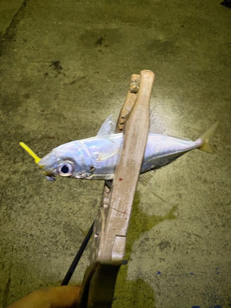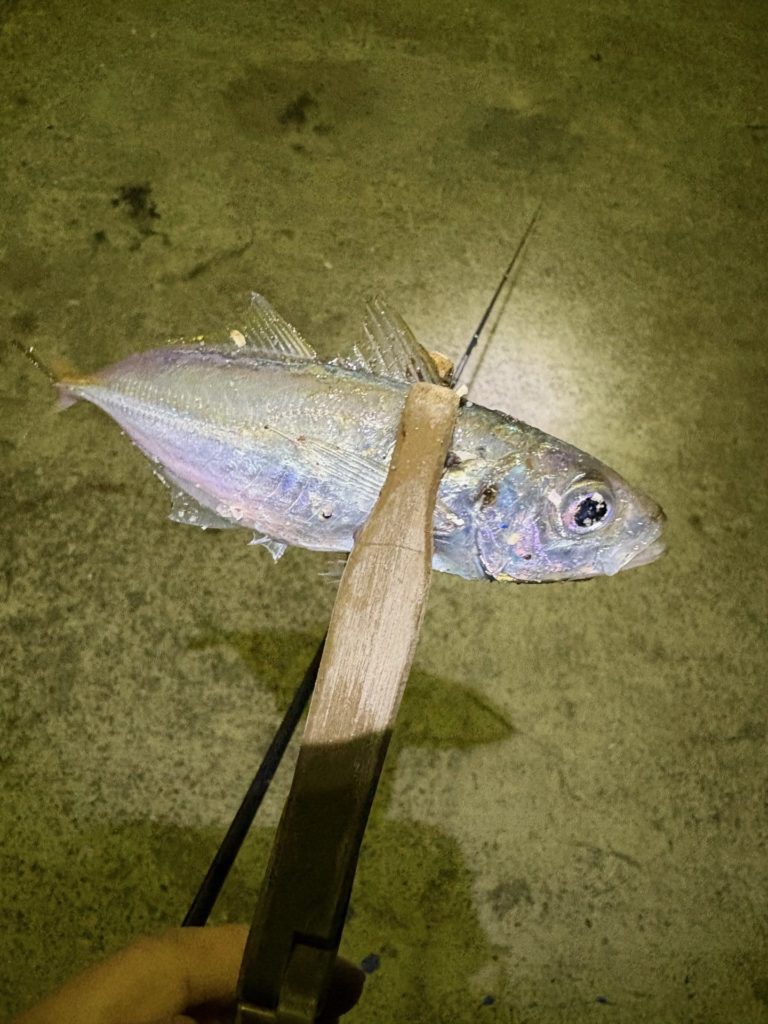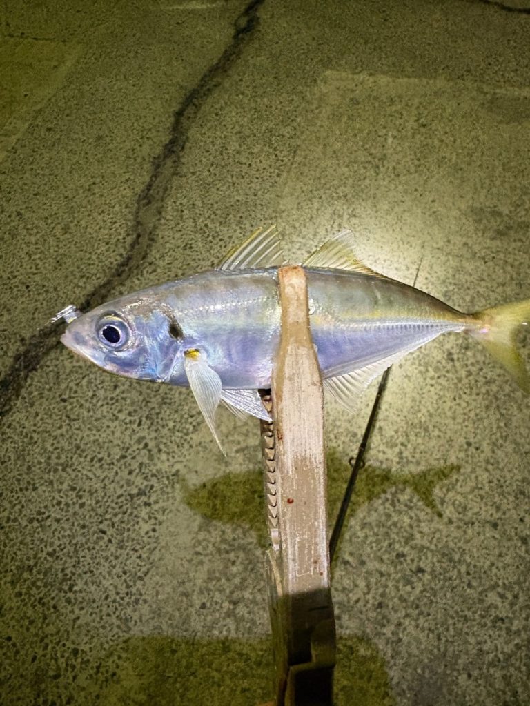 漁船の間を投げていくと、5投目で1匹目のアジが釣れました。