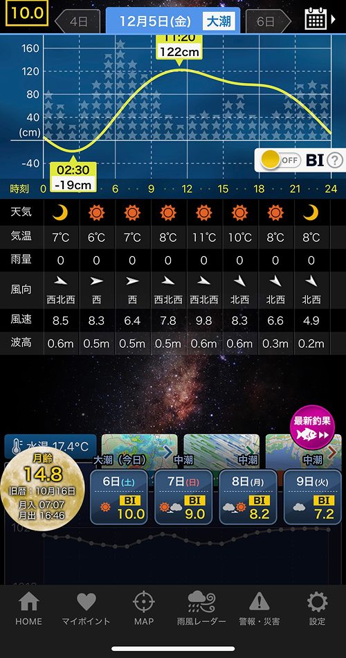 今日は大潮でまだまだ下がっていき、潮位はマイナスまで下がります。